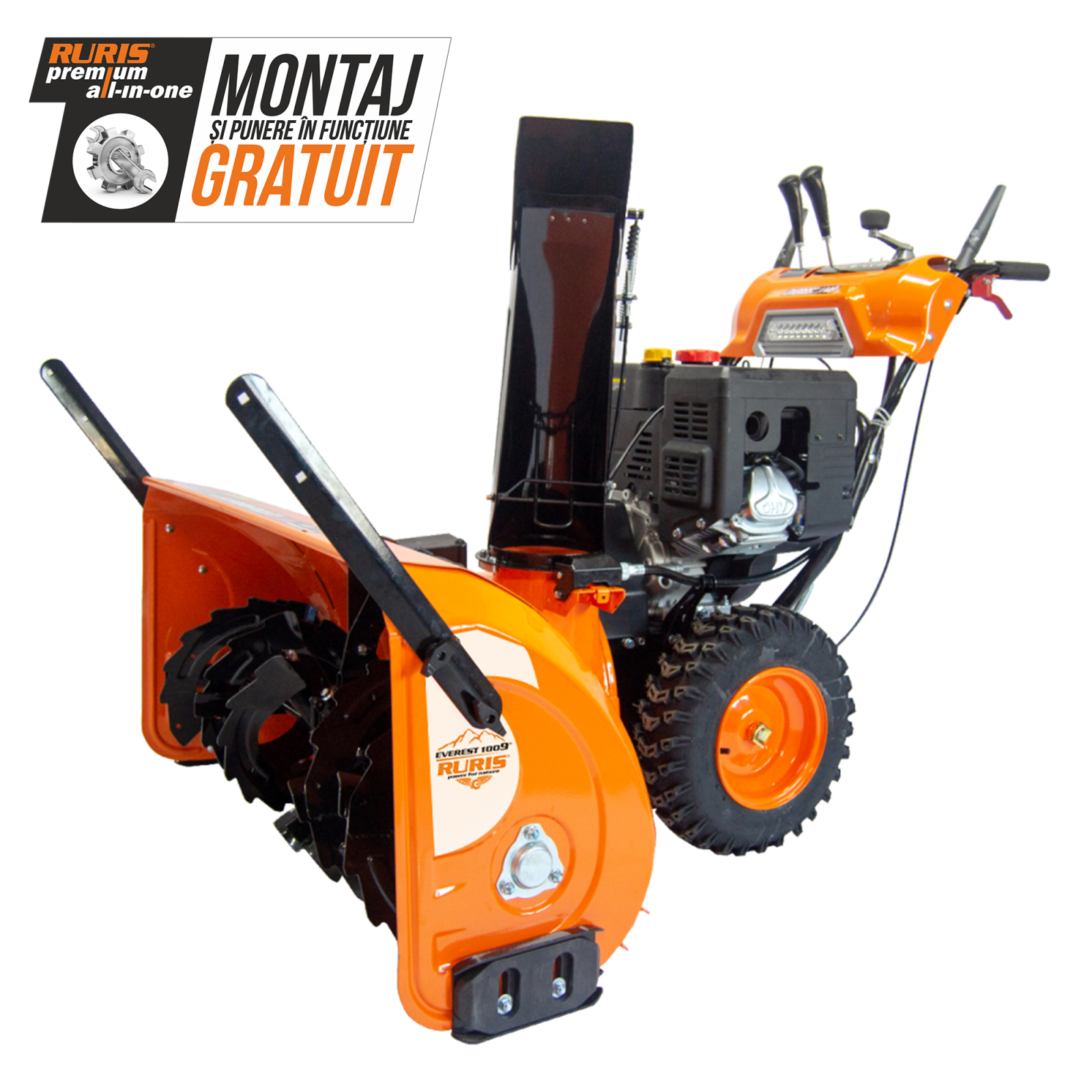 Roțile motrice pentru deplasare sunt fără cameră la interior, tocmai pentru a permite utilizatorului să pătrundă în zone cu denivelări mari. Diametrul roții de 40 cm face ca orice obstacol să poată fi escaladat cu ușurință și în condiții de siguranță pentru utilizator. Garda înaltă la sol oferită de roți protejează șasiul și motorul de obiecte dure sau pietre care pot intra în contact cu freza. Pornirea motorului este făcută automat, la cheie. Motorul este dotat din constructie cu funcția Winter Engine, pentru protecție anti-îngheț și astfel poate porni în orice condiții de depozitare sau de ger. Tot pentru confortul utilizatorilor RURIS, Freza RURIS Everest 1009 este dotată cu far de lucru, pentru a putea lucra în orice condiții termice și pe orice suprafață, farul este cu LED, pentru a face față oricărei solicitări. Viteza pentru deplasare este în trepte, în funcție de grosimea stratului de zăpadă. Utilizatorul poate selecta una din cele 6+2 viteze pentru deplasare și astfel timpul de utilizare este corect dimensionat și consumul de carburant se reduce cu peste 25%. Pentru suprafețele cu zăpadă înghețate, Freza RURIS Everest 1009 poate mărunți și secționa zăpada înghețată datorită profilul cuțitului în formă de “Z” cu care este dotată freza. Suprafața încărcată cu zăpadă înghețată va rămâne perfect curată în cel mai scurt timp.