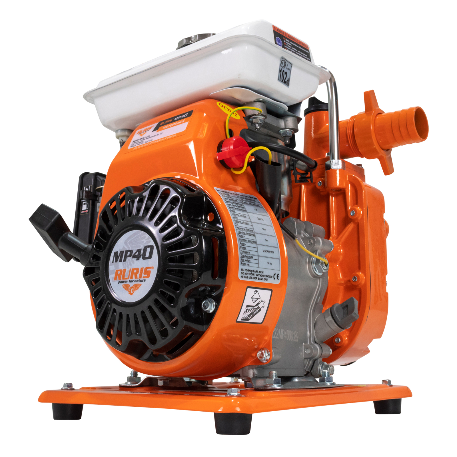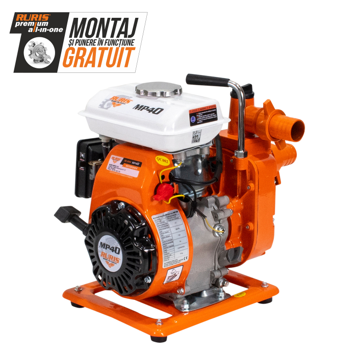 Motopompa RURIS MP40 asigură următoarele caracteristici tehnice: adâncimea maximă de absorție de 8m, refulare pe verticală de 14m, refulare pe orizontală de 140m, iar debitul maxim este de 20m³/h.