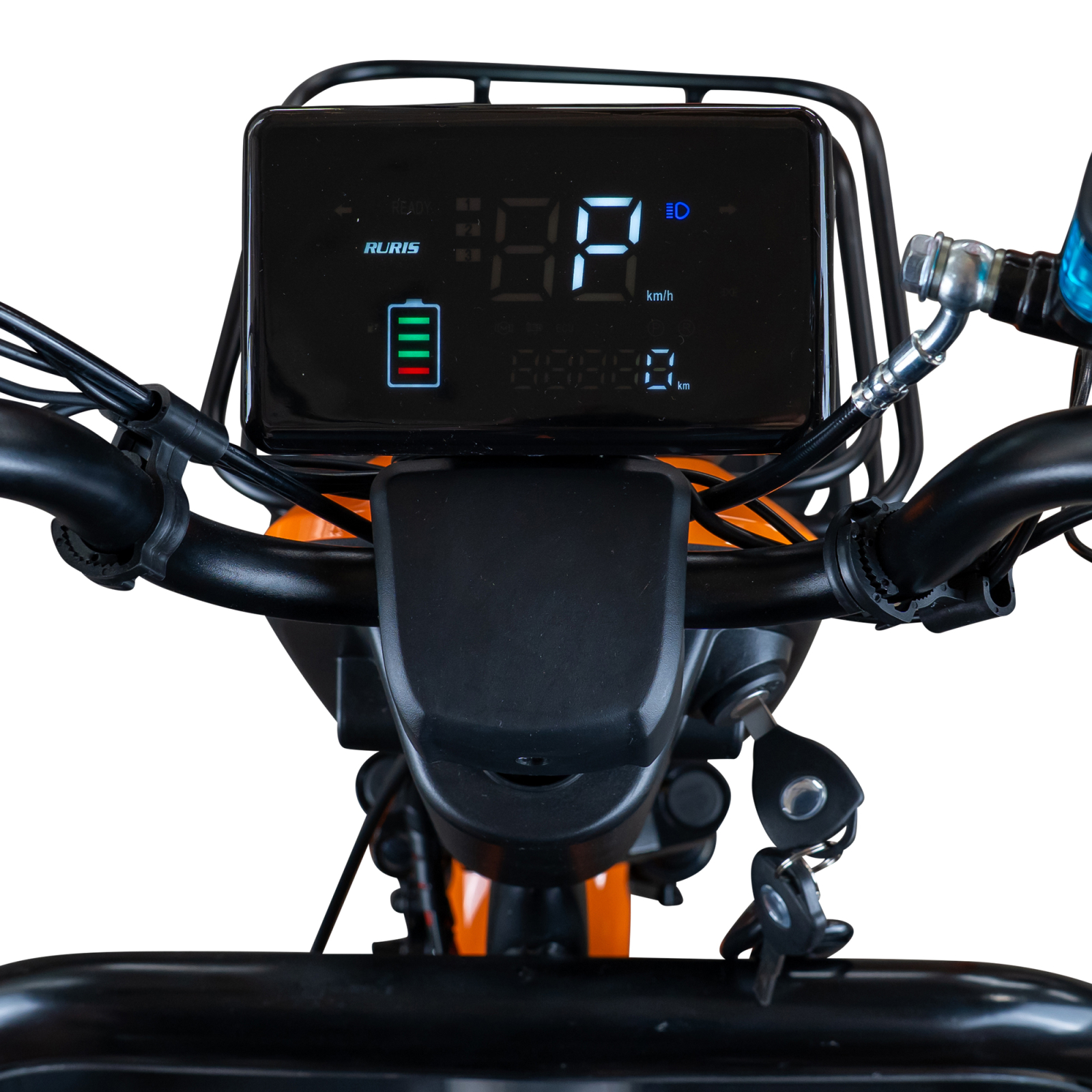 Triciclul electric este echipat cu un display LCD extra large, un avantaj semnificativ care îmbunătățește considerabil experiența de utilizare. Afișajul generos permite o citire clară și rapidă a tuturor informațiilor esențiale – viteză, nivelul bateriei, kilometraj și alte funcții – chiar și în condiții de luminozitate intensă, contribuind astfel la o utilizare mai sigură și mai intuitivă.